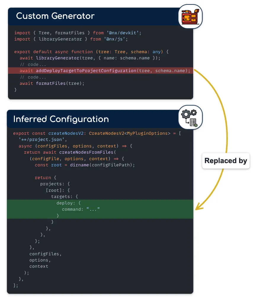 For example, you don’t need to use generators for generating project configuration because it will be supported by your plugin directly. For some use cases, you can even delete the custom generator and use the core Nx Plugin.