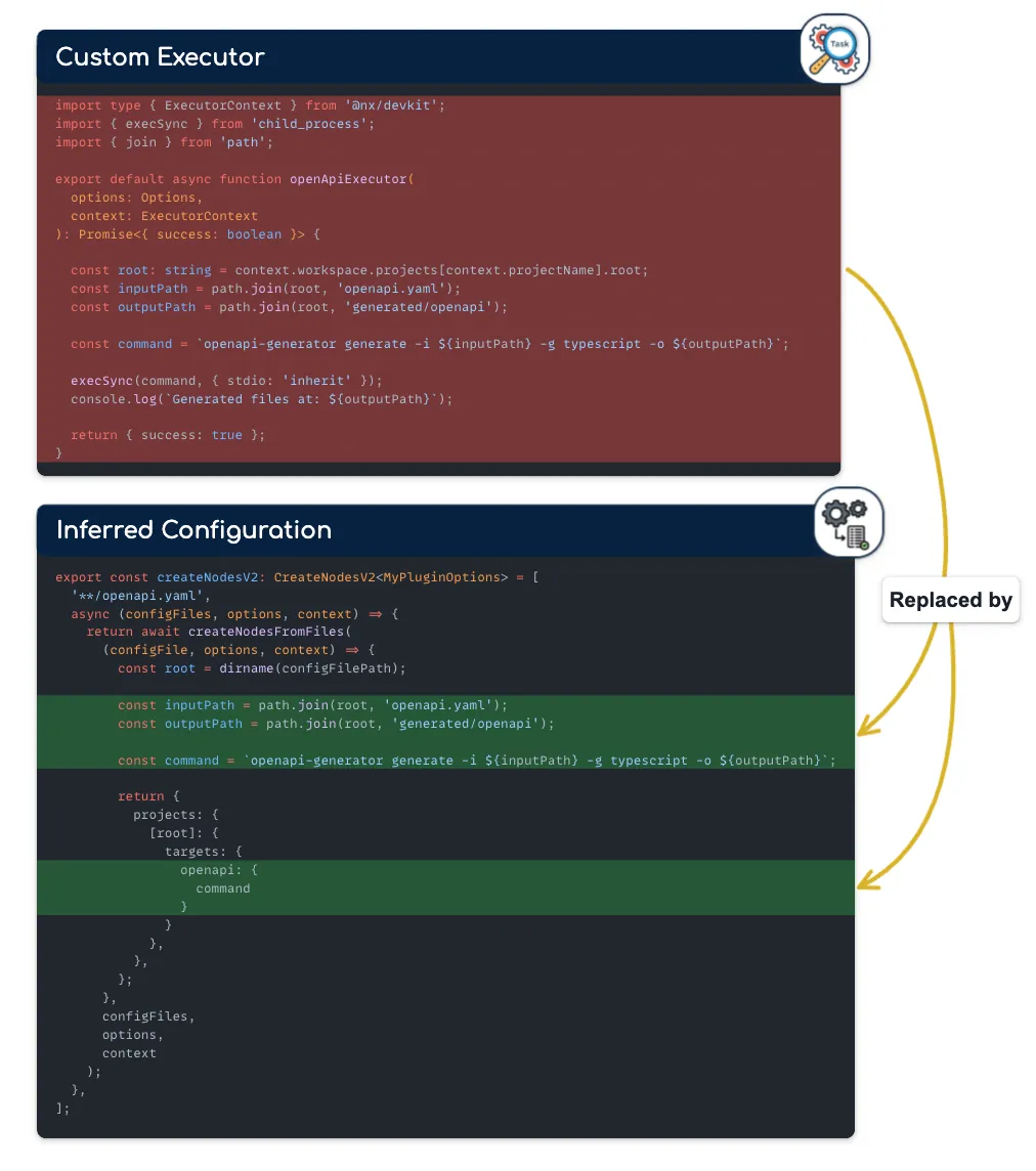 For example, if you previously needed an executor to generate types at the root of your project, such as “executor”: “@org/openapi:typescript”, it is no longer required. This functionality can now be automatically handled by your plugin, @org/openapi/plugin.